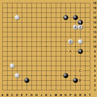 しかし実戦は黒Bにシマリ、白Cに挟むという碁になりました