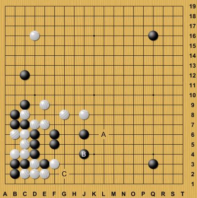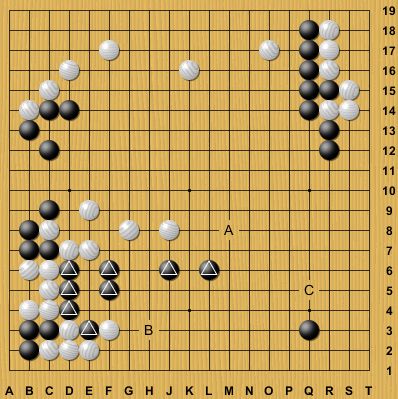 黒は本来Aと飛んだ手でBの方に飛んでCのカドを狙うのが正しかったようです