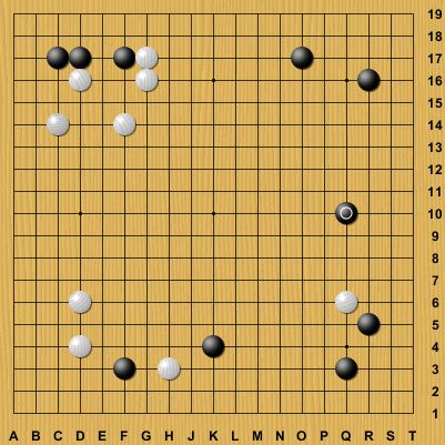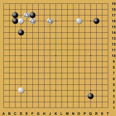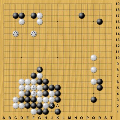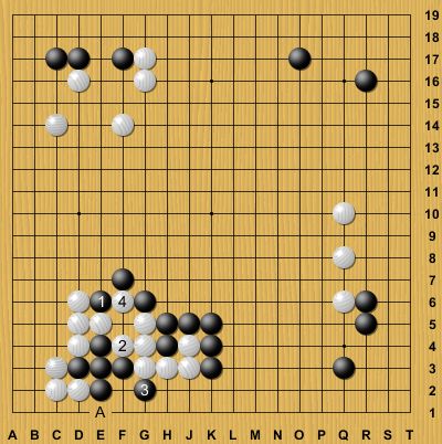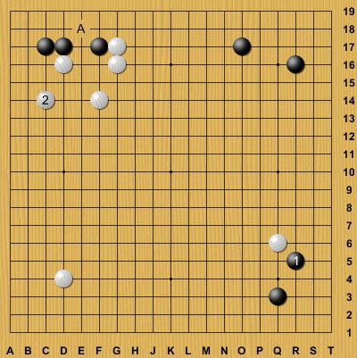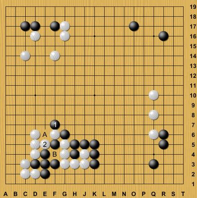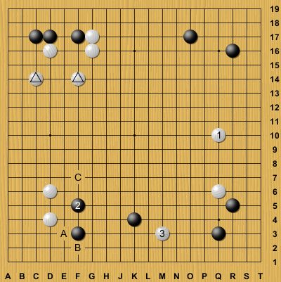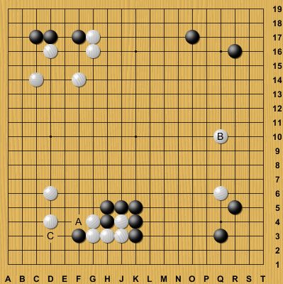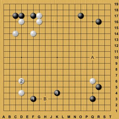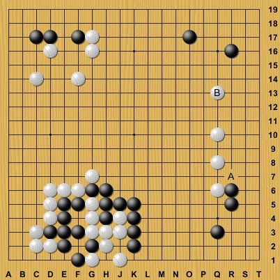 で黒は下辺に展開ここで白はAと右辺を打つべきでした