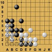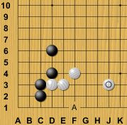 白がAを打つと白地が(黒△4子)×2+□4目で12目。